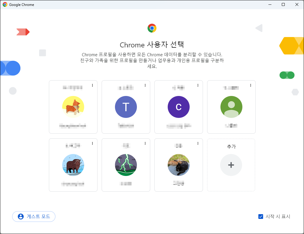 아래에서 보시다시피, 저의 크롬 브라우저는 7개의 사용자로 구분하여 환경을 달리하여 사용하고 있습니다. 즉, 개인 프로필을 구분하여 사용이 가능하며, 한 사람이 여러 개의 아이디를 구분하여 사용도 가능합니다.