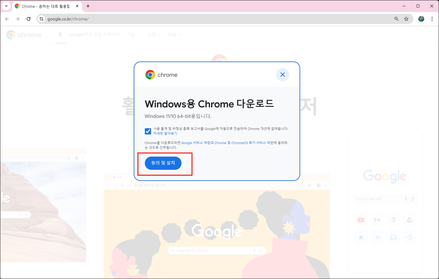 3) 크롬 다운로드 버튼을 누르면, 아래처럼 Windows용 크롬 다운로드 팝업이 뜨며 간단하게 약관동의를 할 수 있는 화면이 나오는데, 여기에서 동의 및 설치를 누르시면 크롬 다운로드가 시작됩니다.