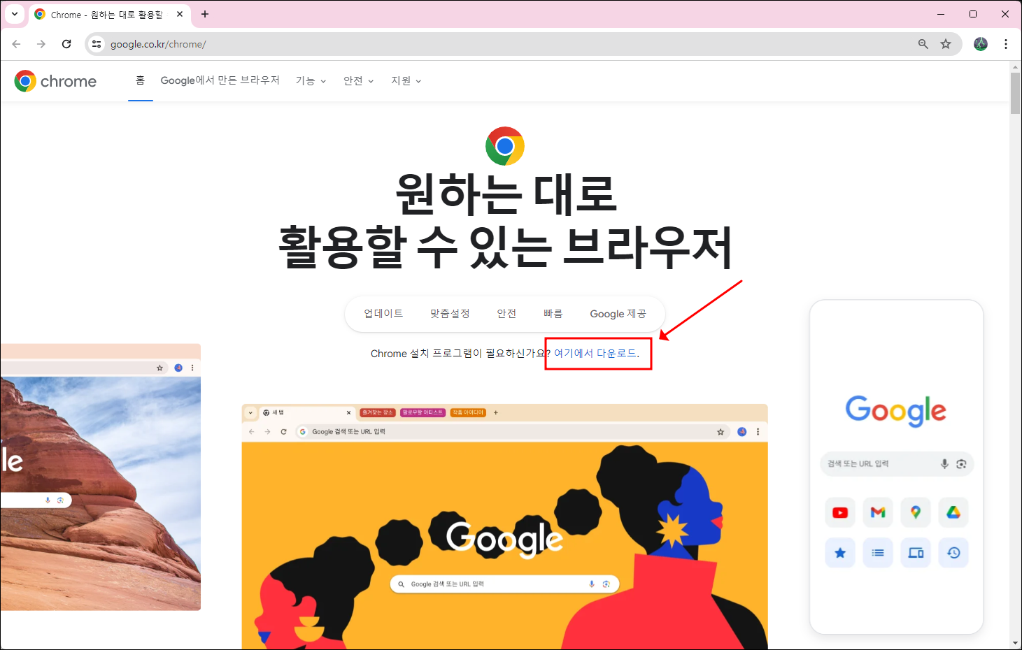 2) 위의 웹사이트에 방문하시면, 아래와 같이 구글 크롬 정식 웹사이트를 보실 수 있습니다. 화면 중간에 있는 여기에서 다운로드 버튼을 눌러 크롬 다운로드를 시작합니다.